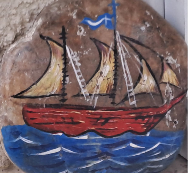 -Όχι Κωστή ,είναι το καραβάκι που θα κρατάμε στα κάλαντα . -Όταν περάσουν τα Χριστούγεννα θα το βάλουμε στο αυλάκι να κολυμπήσει; Επέμενε ο Κωστής. .