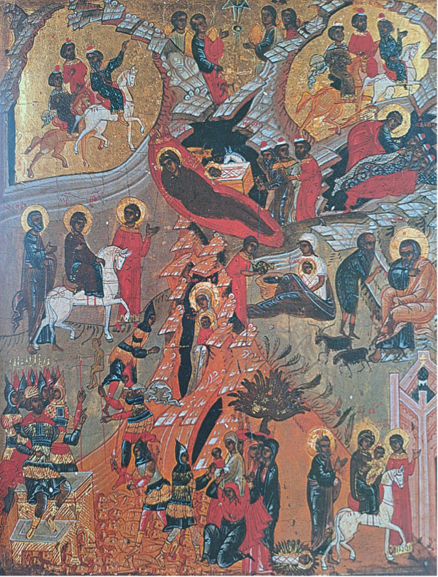 Αριστερά του σπηλαίου εικονίζονται οι τρεις Μάγοι, κρατούντες τα δώρα σε κιβωτίδια, τον χρυσόν, τον λίβανον και την σμύρναν.